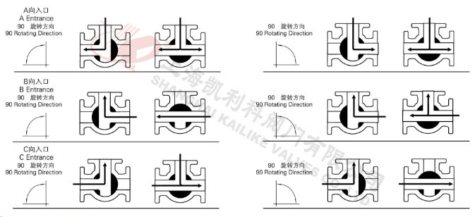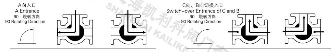 電動三通球閥分L型和T型,介質流通方向見下圖。L型電動三通球閥適用于介質流向的切換,能使相互垂直的兩個通道連通:T型電動三通球閥適用于介質的分流、合流或流向 切換,T型孔道可以使三個通道互相連通或使其中兩個通道連通,電動三通球閥一般采用三個閥座結構,亦可根據(jù)用戶要求采用四閥座結構。