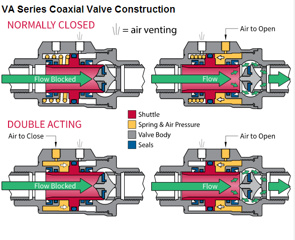 閥2同軸的位置,閥可以是氣動或電動地驅(qū)動。電動版本使用電磁線圈和彈簧,類似于螺線管閥。該版本使用氣動空氣壓力和彈簧(彈簧復(fù)位),或空氣壓力在兩個(gè)方向(雙向)。使用同軸閥往復(fù)型障礙物,穿過介質(zhì)時(shí)打開。該傳送裝置移動到一個(gè)位置或另一個(gè)來執(zhí)行其功能,或者開/關(guān)或分流流量到適當(dāng)?shù)某隹?。同軸閥(10)具有更大的流動通道的電磁閥相比,但仍然沒有完全的閥端口。那是真的,又有一個(gè)限制流量和壓力損失的增加。有風(fēng)格多樣的同軸閥。兩個(gè)例子是VA系列氣動操作閥的開/關(guān)VAX系列電動或氣動同軸閥可在2-3開/關(guān)方式或雙向分流。對于許多應(yīng)用同軸ON/OFF閥使代替球形閥。同軸閥將提供較小的閥更快操作的球閥將典型地具有較高的流速與壓降較低。